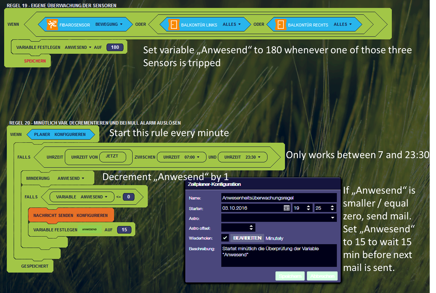 If you have the same problems, this could be usefull for you. The fact is, that Zipabox is such a meighty tool and if you e.g. only want to observe some sensors during daytime it meight be even easier to use your own routine. So far this seems to work quite fine and it has an additional advantage: If my mother falls down to the floor at let´s say 20:00 and doesn´t move at all, a three hours healthcaremode would start all over again next morning, assuming it stops at 23:00. So it will only fire an alarm three hours after the next activation. This rule would continue to count down and send a mail right in the morning.