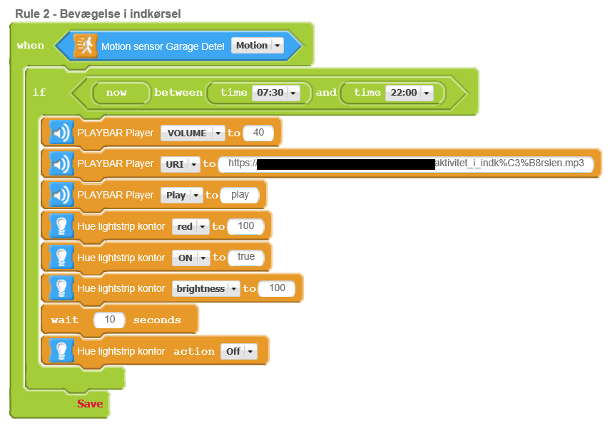 Have an existing simple rule, which play an MP3 file at a volume of 40% when there is someone in my driveway. This function just fine!