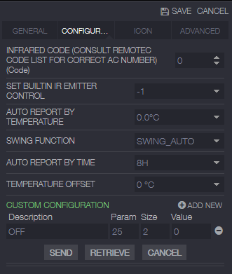 On bottom input Param (see user manual), Size and value and press SEND button (see configure_1.jpg).