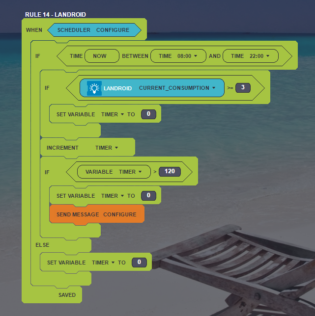 Please also note that this rule tests for 120 minutes absence within your specified time window, as stated initially. If, on the other hand, you want to also check that the robomower actually returned home for the night, and get notified at 8:00 if it didn't, please use the second rule instead.
