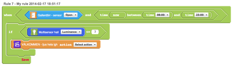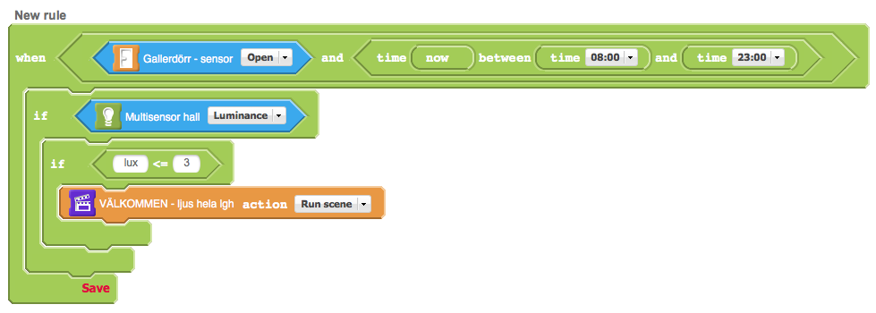 How do I create a rule that, if triggered by a Fibaro door sensor (when the door opens) between 08:00-23:00, runs a scene if the light meter (Aeon Labs multisensor) is 3 lux or less?Regards,Aril