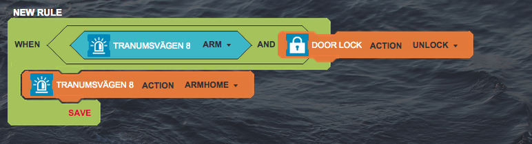 Please note that arm state can be used in Rule creator as condition for triggering rules. To be able to use it, put Alarm in Sensor puzzle. Then you will have a choice to chose "Arm", "Disarm" and "Any" as condition for rule.