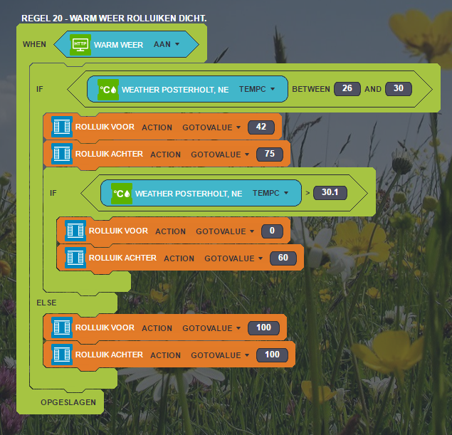 When the temperature rises above 30 C, the rollers have to close a bit more but when the temperatue drops again between 25 and 30 the rollers must be opend until 42 and 75 and when the temperature drops even more, less then 25 C, the rollers have to go 100. Also this rule may not work before 9:00 AM.