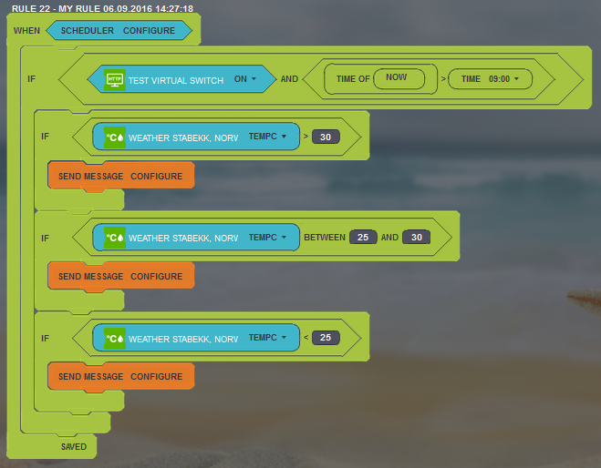 Thus, for your automatic, temperature controlled blinds to work, you need the rule to run every so often. I'd suggest you use a scheduler set to every 15 minutes as the only WHEN clause. This ensures your rule actually WILL be run.
