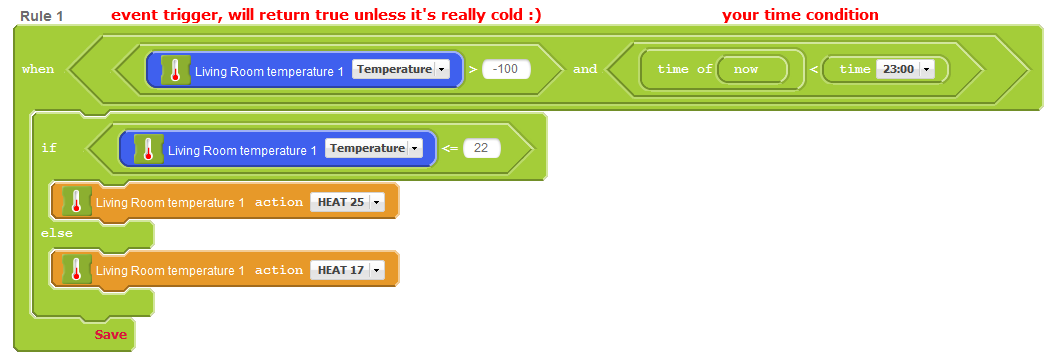 I created a new set of rule as per the image attached. It doesn't work, events monitor does not show any actions relative to setting the temperature.