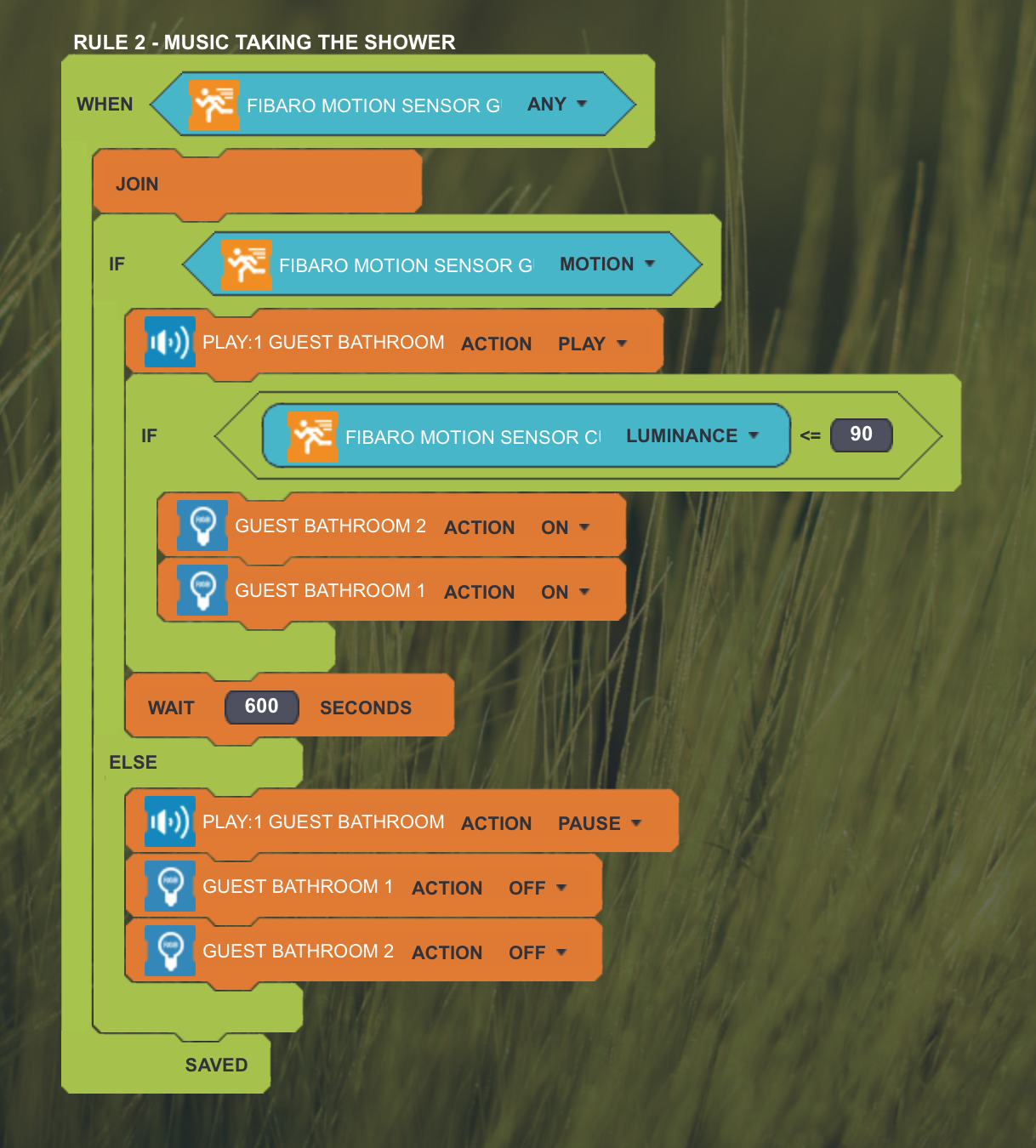 I have defined the rule attached which should turn off both the light and my sonos player when I enter the bathroom.