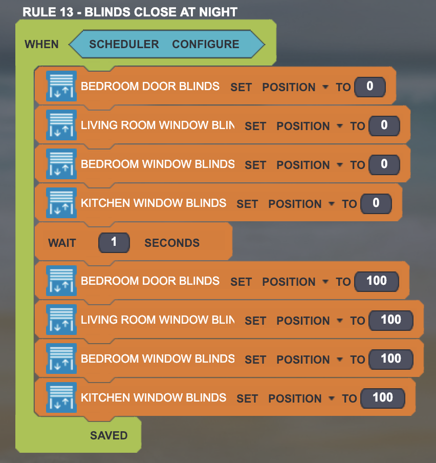 I have a rule which closes my Somfy RTS blinds. It's set to run at a specific time (scheduler). Due to an issue with controlling Somfy blinds, it first sets the blinds position to 0, waits 0.5 second, and then sets the blinds position to 100 (this is the only way I could make it work for sure, otherwise there could be issues due to the way Zipato handles it). In general, it works fine.