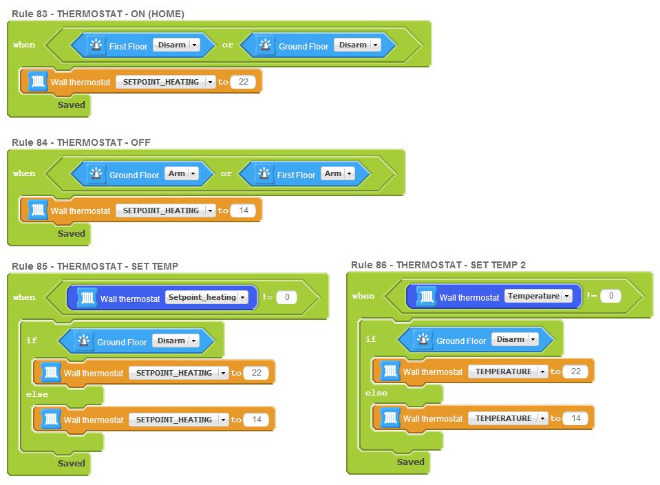 I have attached my configuration and would like to know if someone can help to get the system working so the temperature is kept at 22 degrees when Alarm is not armed and 14 degrees when Alarm is armed.