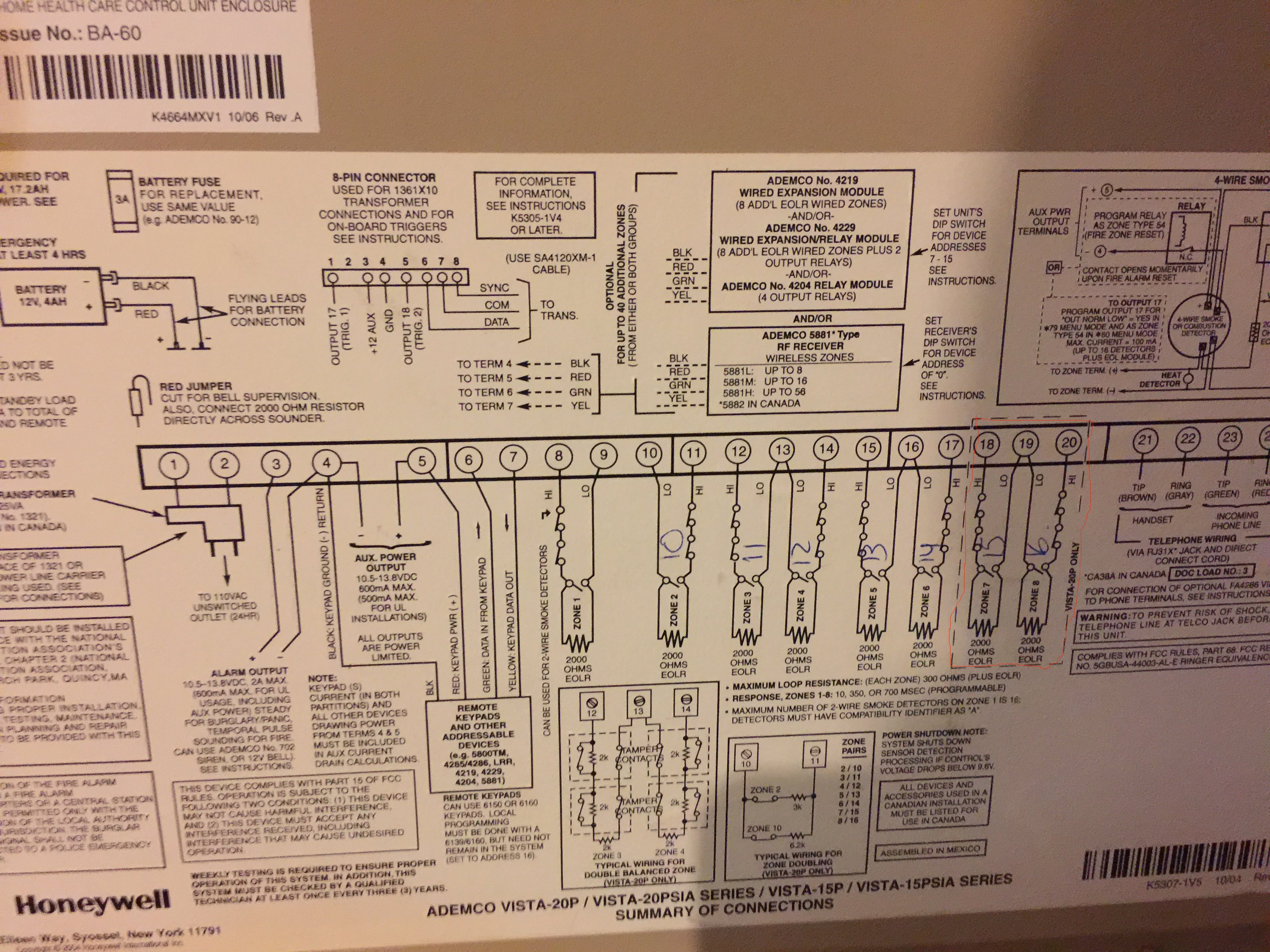 Attempting to connect zones from a Honeywell Vista Alarm panel to a security module.