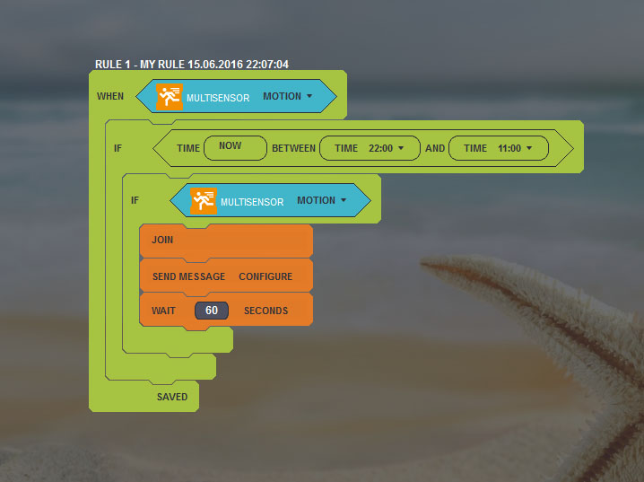 I created a rule which should send a message when motion is detected within a certain time frame (22:00-11:00), and I can see on the log that motion got detected but no message got sent. Tried push, email and sms, none worked. See attach of the rule, if there's anything wrong in that.