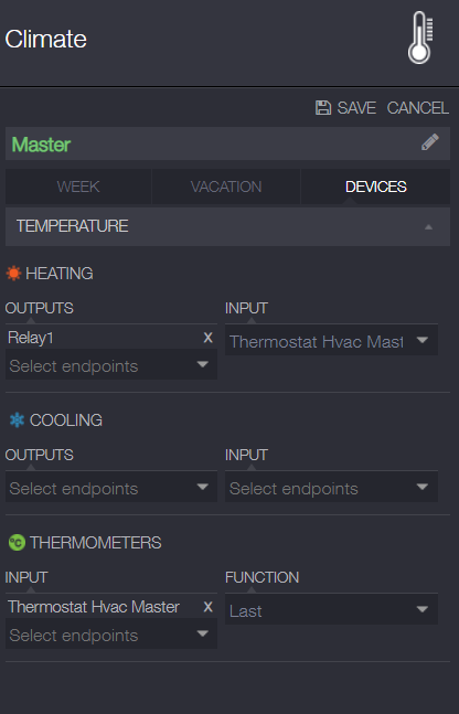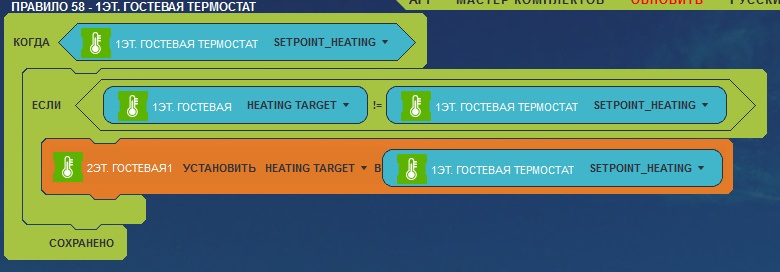 Добрый день. Для того, чтобы значение уставки SRT должны быть передано на виртуальный термостат, я использую правило, указанное выше. Для того, чтобы значение уставки виртуального термостата, чтобы быть переданы на СТО, необходимо поместить SRT в выходной секции нагрева виртуального термостата. И не забывайте о синхронизации после каждого изменения. В настройках SRT, необходимо указать время пробуждения 10 минут, так как, если виртуальный термостат не получает значение температуры в течение 30 минут, он показывает температура по умолчанию составляет 22 градусов.