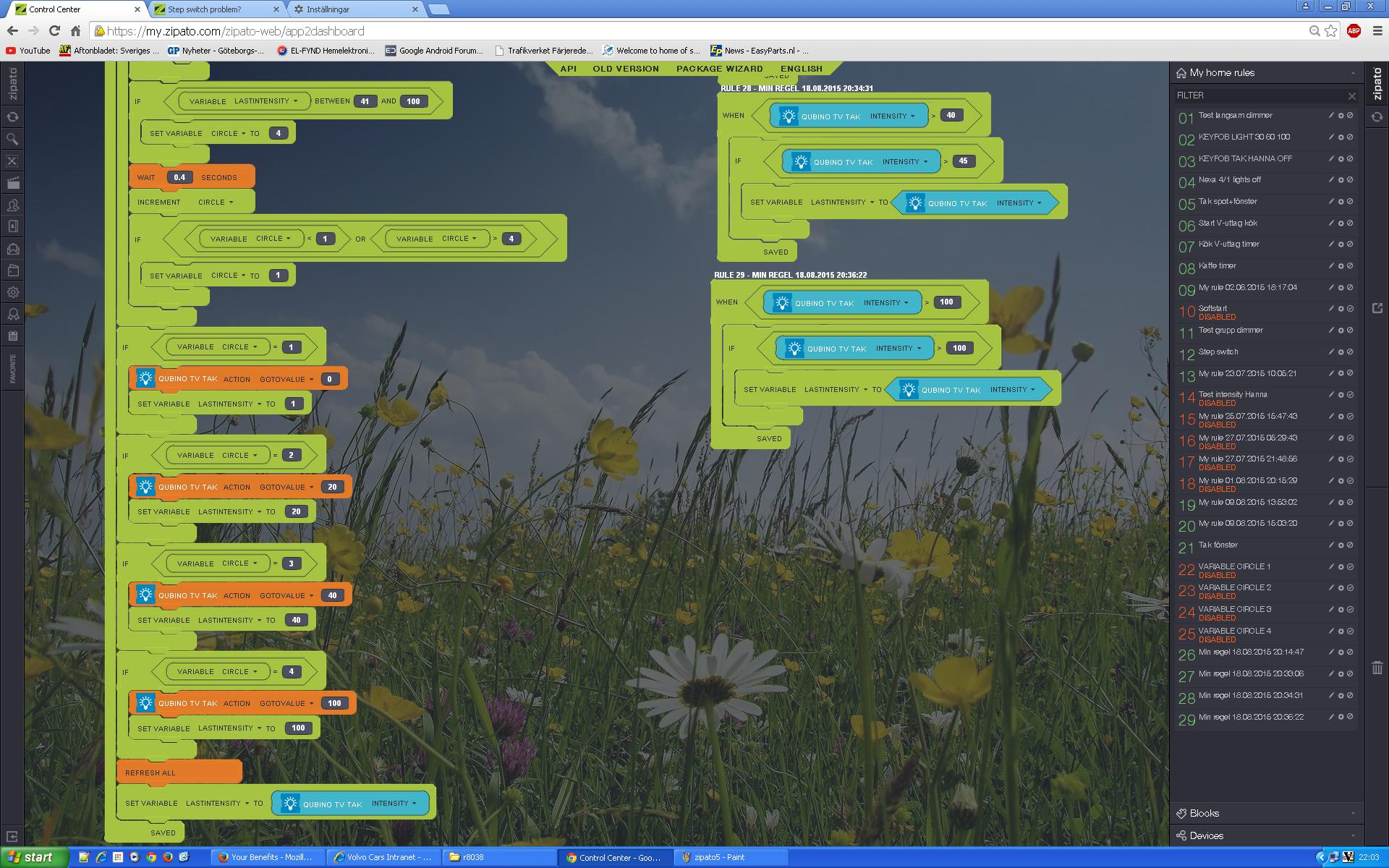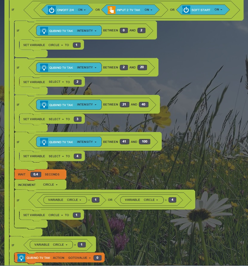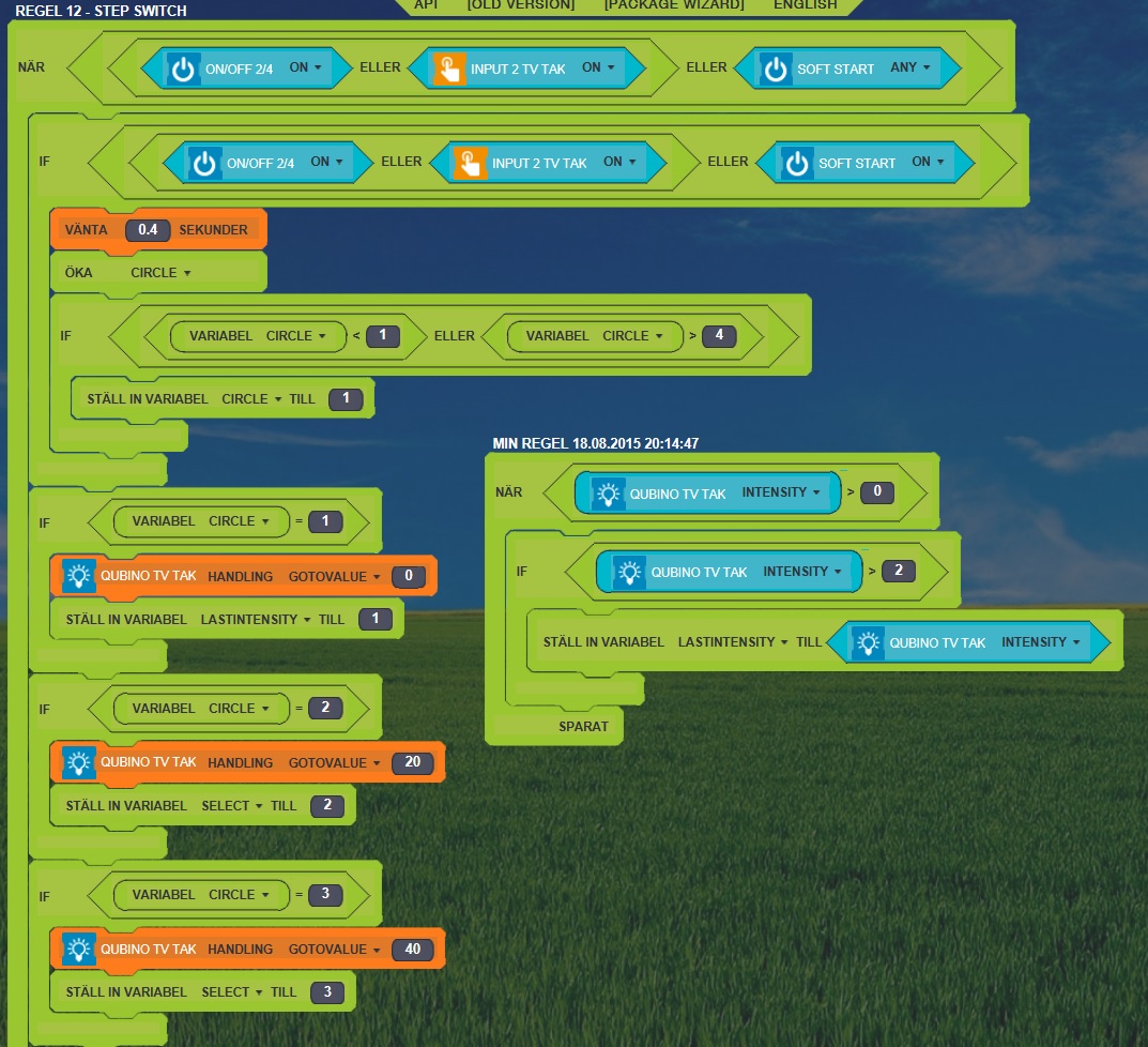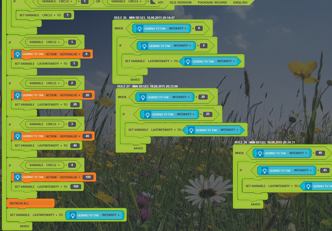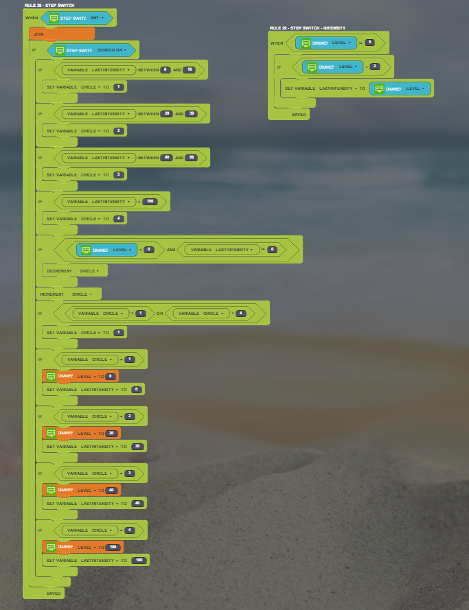 This rule works so that every time I press one of the remote control buttons or wall switch, connected to the Qubino dimmer or a virtual switch the light level in the living room jumps to one of the 4 values.