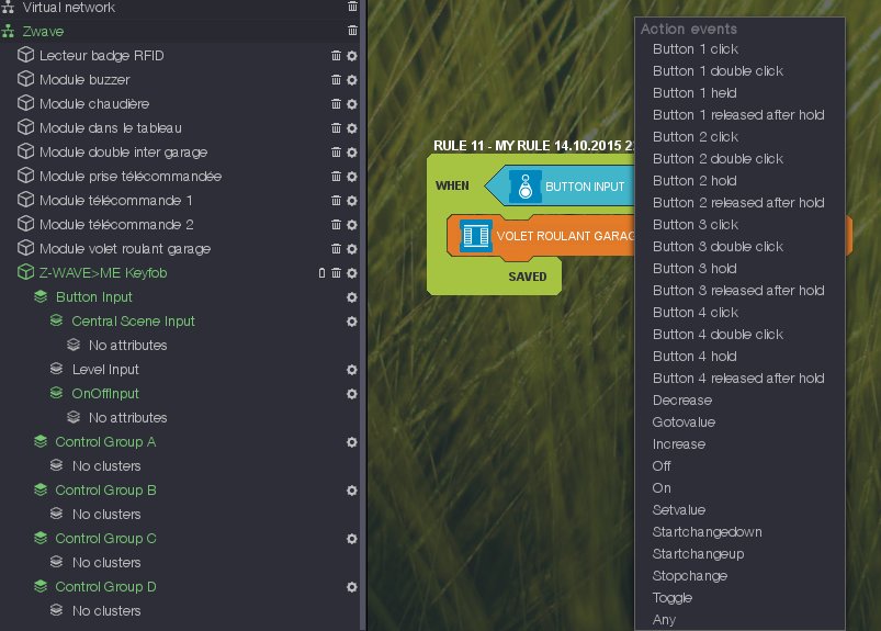 I have reset my keyfob and join it again. I get this (see attached picture). As you can see, I get a long list of events for use in rules. I didn't change anything in configuration. For each button, there is 4 events: click, double click, hold, release after hold. If you select "click", if you press button slowly, the rule is not triggered because it's an "hold" event. To avoid this, in my rules I have done an OR with "button click" and "hold".