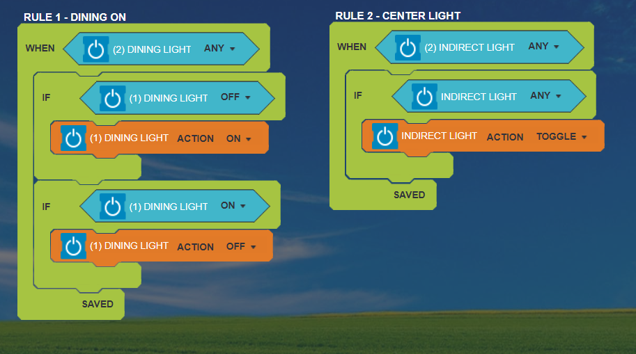 Could you please give me an example of how a rule should be done for a two way light control, meaning controlled from two separate modules, one which is connected to light and another only to switch.