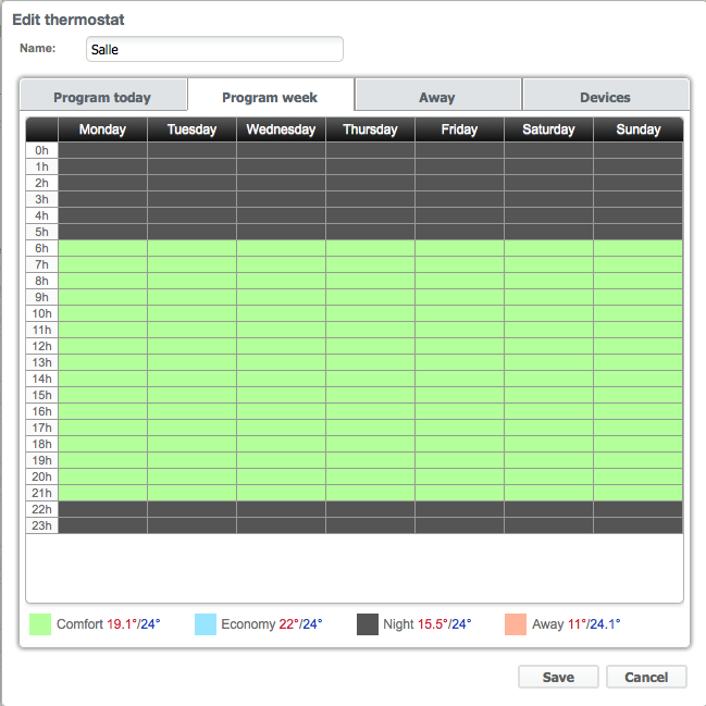 It's not possible. Each time I do something it breaks. This time, I define away period and then I noticed I didn't change the temperature. Then I change the temperature to 11° and the temperature is the dashboard is not 11°