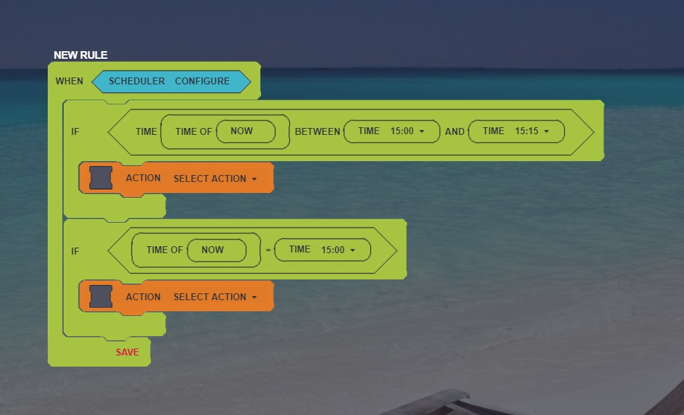 If you want to test Zipabox time without scheduler you can use as any of both examples on IF statements attached. Of course you can use whatever event on the WHEN puzzle to trigger this rule.