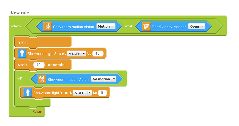 other example for more complex rule, please see attached picture.This rule combines motion detector and door sensor.