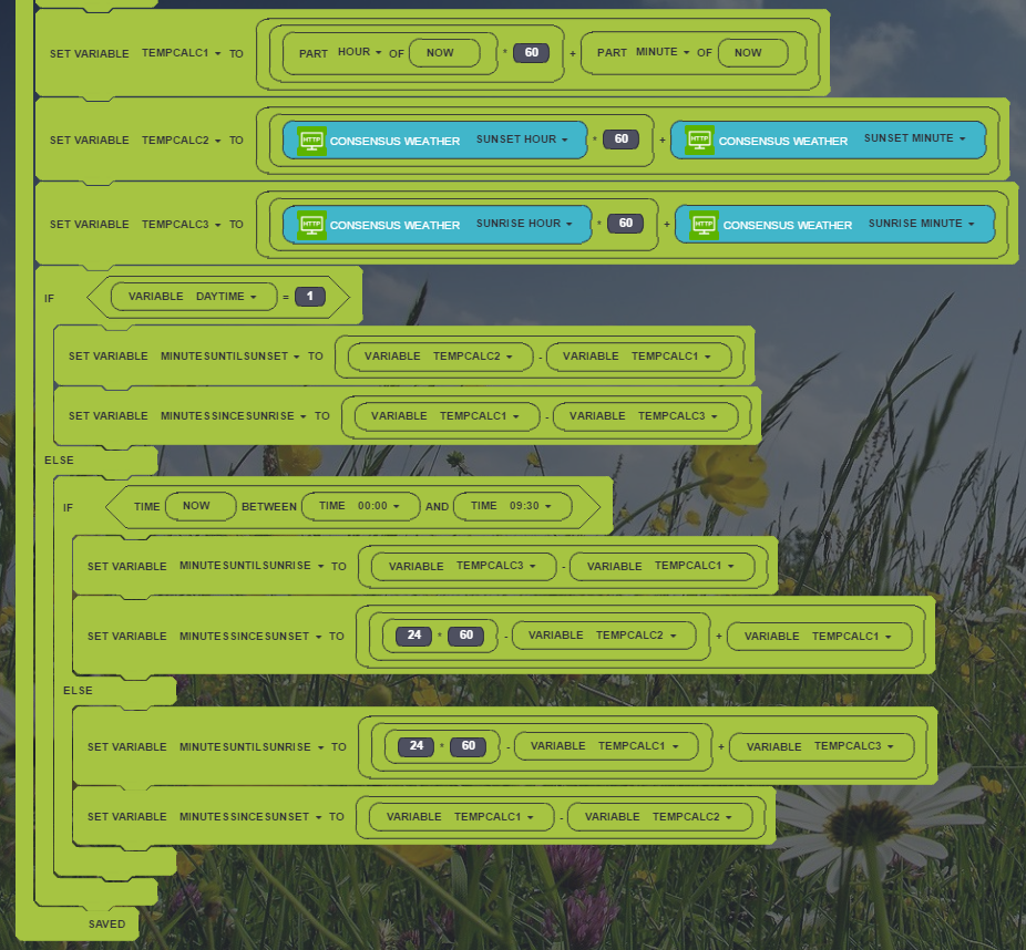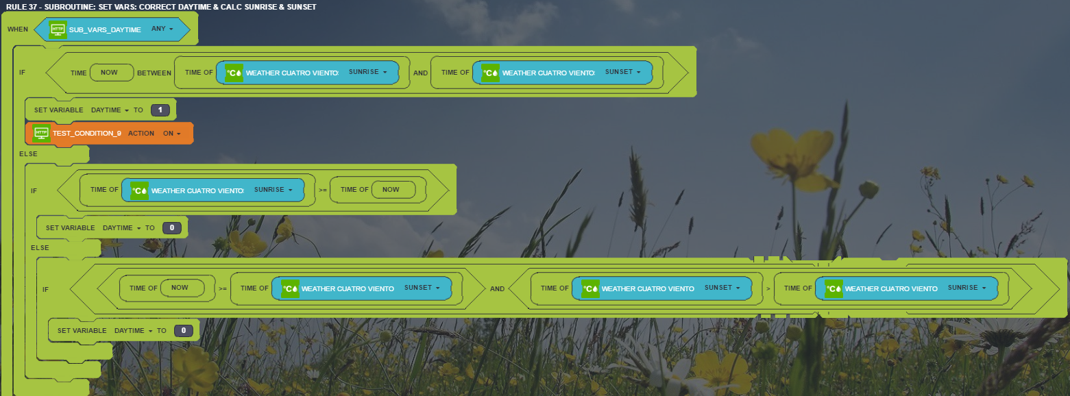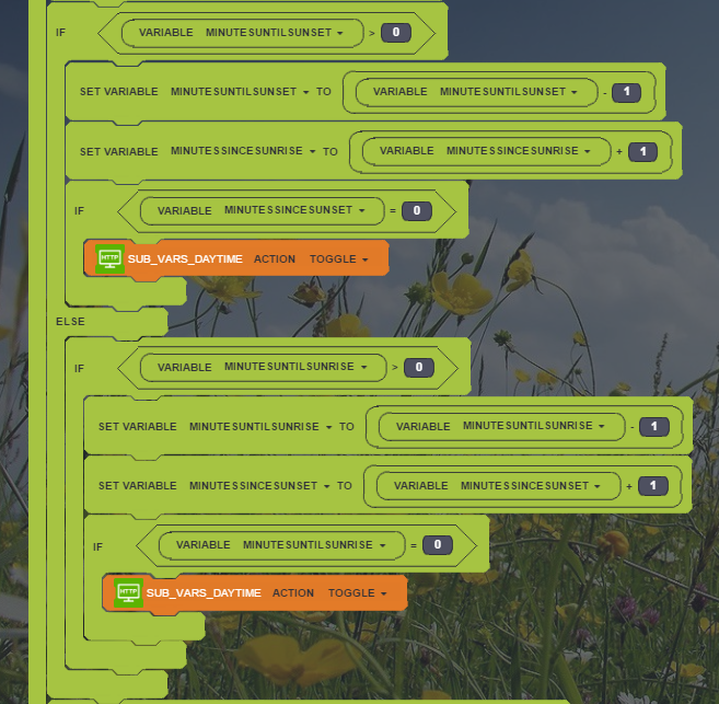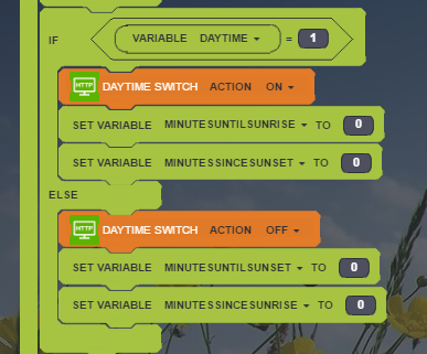 By any change of luminance I check the current time. If it is between sunrise and sunset from the virtual weather station I set the virtual switch day (Tag) to on and night (Nacht) to off. If it is not I set the switches vice versa.