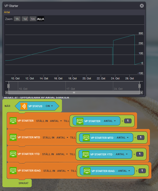 See attached picture of one of them. VP Starter is a counter which adds up +1 every time the switch VP Status is turned on. Works for several days but is reset now and then ??? Box is not restarted. Drives me crazy ???
