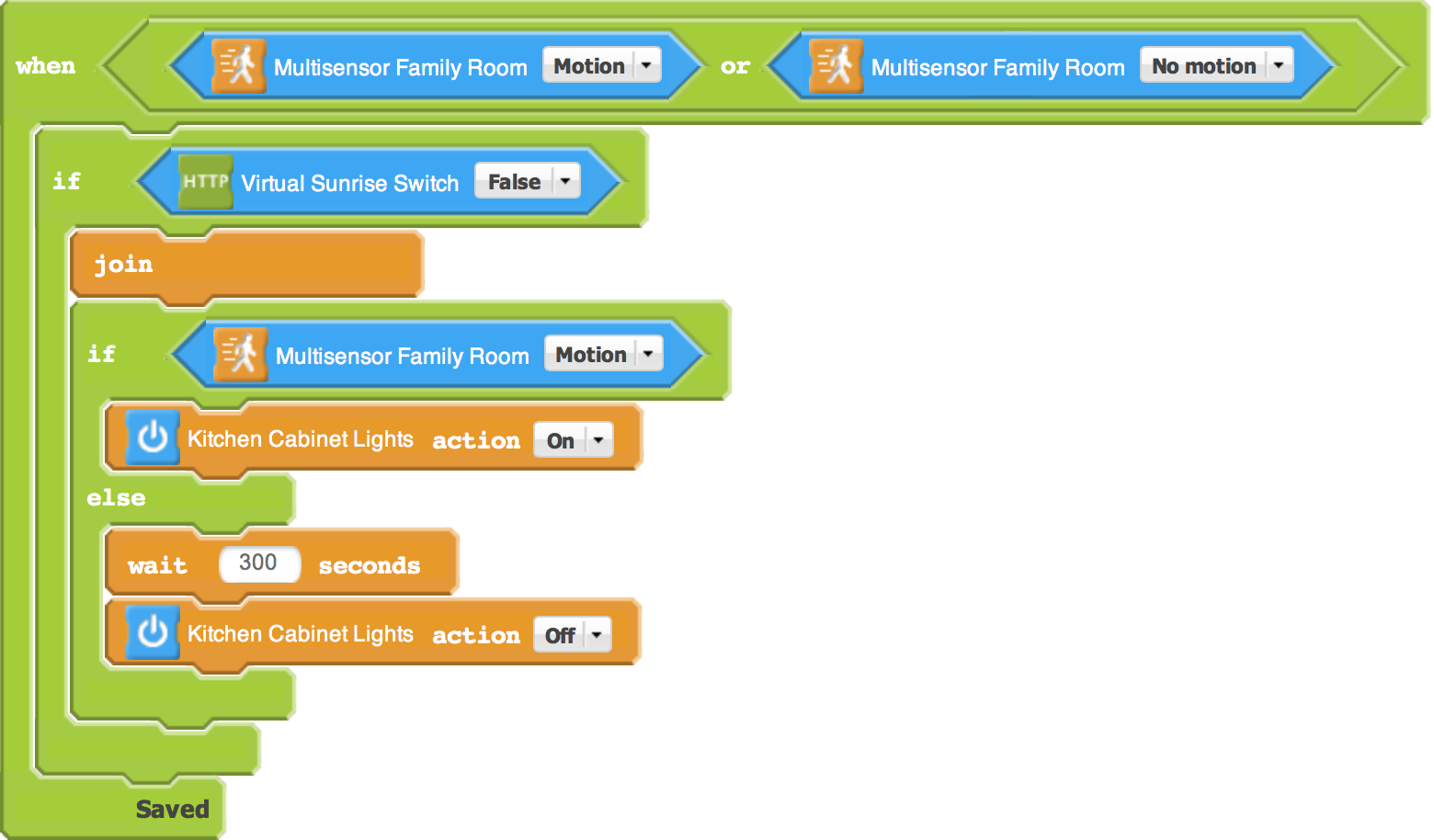 One of them, uses virtual sensor bind to virtual switch which toggle depending on sunset/sunrise. It all looks good, I can see that sensor toggles and then switch changes as well. My rule uses motion detector (multi sensor, so I had to use motion on or motion off to avoid triggering by temp/humidity changes) as a trigger and then checks if we are past sunset (switch off/false) and turns the lights on. THIS USED TO WORK before the factory default. It does not work anymore, basically the motion detector triggers the rule despite virtual switch being false (during a day). Please see the actual rule attached. I used sensor puzzle and actuator of virtual switch.
