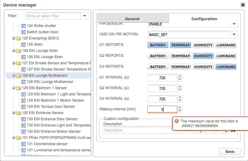I cannot save any settings as the wakeup-interval says its maximum value is a large negative number. This is with firmware 0.9.995, I was getting NO_MOTION every minute with 0.9.994 (all with an Aeon Multisensor which worked in the past)