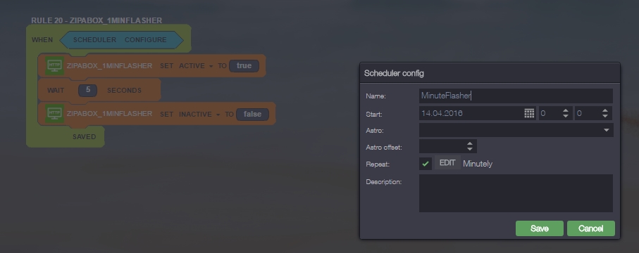 2. Rule 2 runs when variable is less than 1 and minute flasher active, do some stuff and set value 1 to SFS.