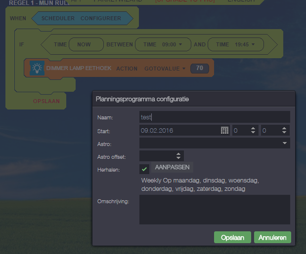 I'm only just starting to work with the rule creator, but it already gives me a headache. I want to create a rule to set my dimmer to a certain level in a specified timeframe, but it just doesn't work...