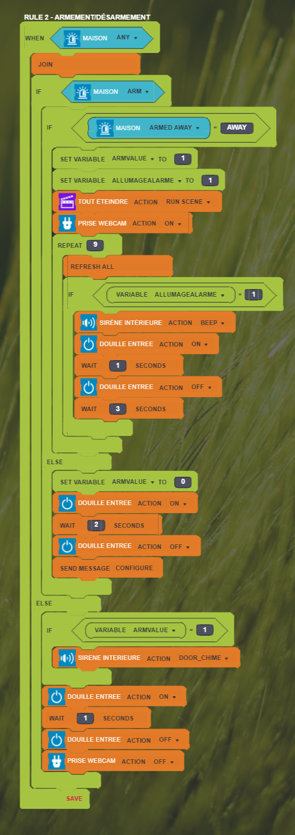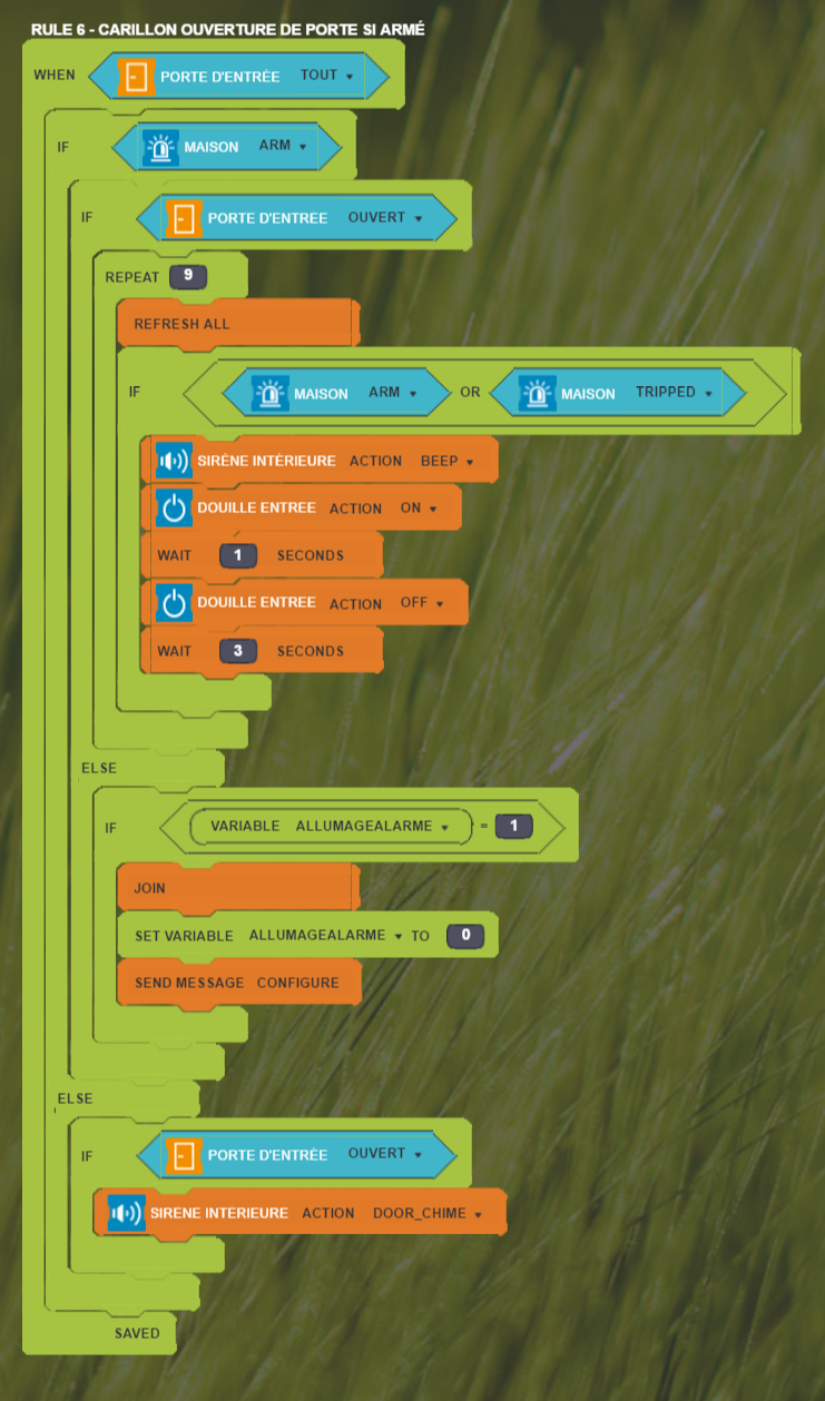 • one 'AllumageAlarme' (I'm french, it means 'ArmingStatus') that is set to '1' when I start the arming procedure and reset to '0' when I want it to stop (on closing front door)